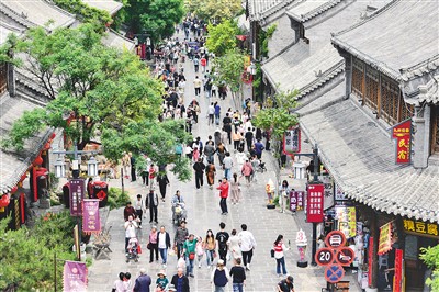5月3日,游客在山東青州古城景區(qū)游玩。