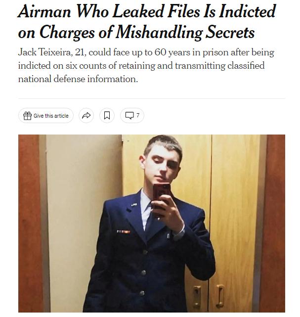 中新網(wǎng)6月16日電 綜合外媒報道,當?shù)貢r間15日,美國聯(lián)邦大陪審團起訴21歲的空軍國民警衛(wèi)隊成員杰克·特謝拉(Jack Teixeira),罪名是保留和傳播國防機密信息等。