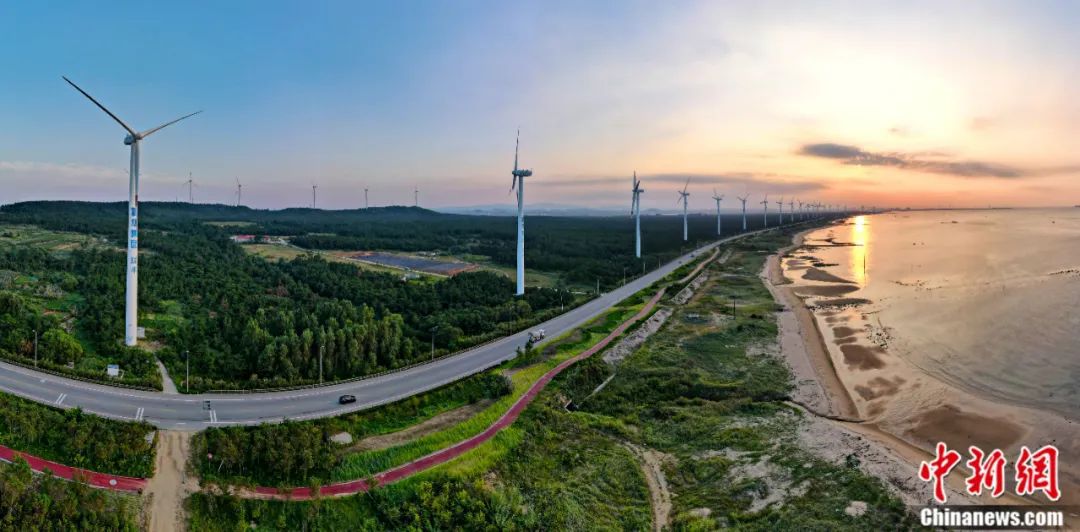 山東省榮成市北環(huán)海路,風(fēng)力發(fā)電機(jī)與沿海防護(hù)林形成一道靚麗的風(fēng)景線。近年來,中國(guó)大力推廣風(fēng)電產(chǎn)業(yè)等“綠色能源”,實(shí)現(xiàn)生態(tài)保護(hù)和可持續(xù)發(fā)展。楊志禮 攝