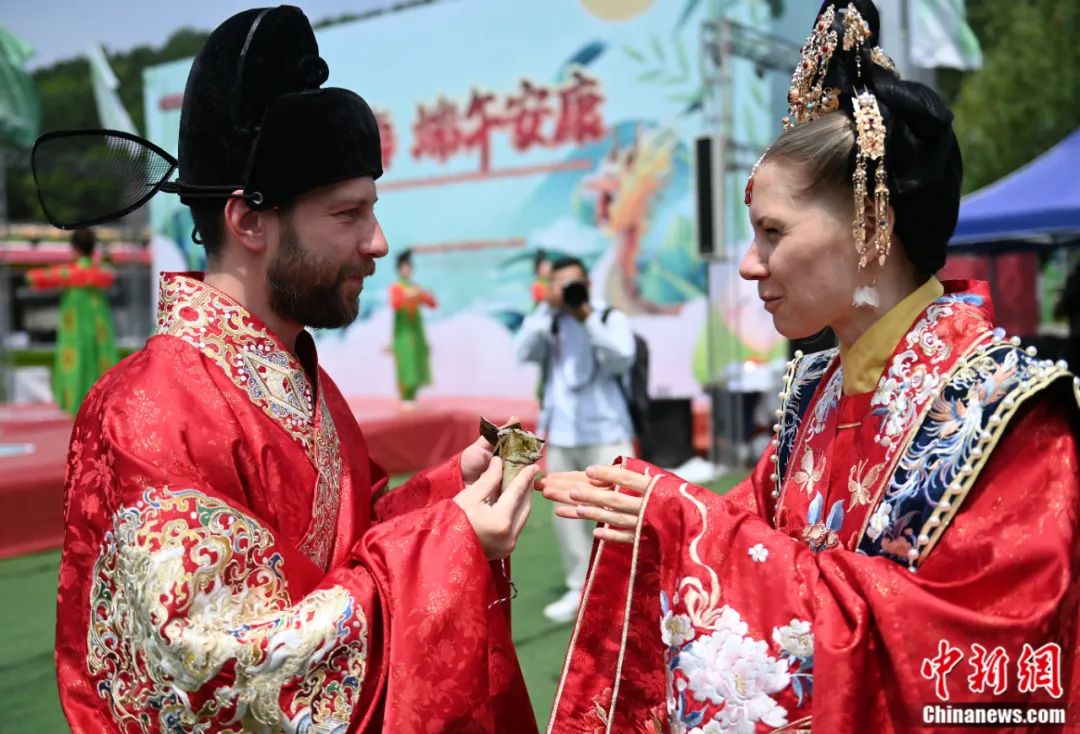 2013年6月16日,一對(duì)外國(guó)夫婦品嘗粽子。當(dāng)天,一場(chǎng)外國(guó)友人體驗(yàn)端午節(jié)習(xí)俗的活動(dòng)在吉林長(zhǎng)春舉行,近百名外國(guó)友人通過(guò)穿漢服、品嘗粽子、戴香包、投壺等“沉浸式”體驗(yàn)活動(dòng),感受中國(guó)傳統(tǒng)節(jié)日的魅力。張瑤 攝