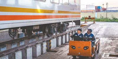 中國師父毛鑫(右)與學(xué)員彼得·恩堅加在內(nèi)羅畢站區(qū)運(yùn)轉(zhuǎn)車間內(nèi)調(diào)度車輛。