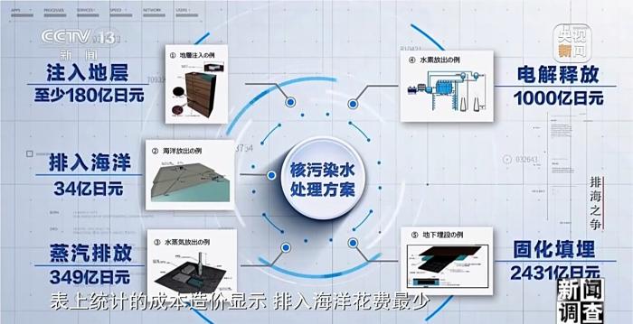 經(jīng)過兩年半的研討,日本技術委員會總結出了五種處理方案。方案一,注入地層,將污染水注入2500米深左右的地層結構中。方案二,排入海洋,將核污染水稀釋或分離放射性物質后排入大海。方案三,蒸汽排放,將核污染水進行蒸發(fā),通過排氣管道排入大氣。方案四,電解釋放,將核污染水進行電解反應將生成的氫氣排入大氣。方案五,固化填埋,把核污染水和水泥等材料混合成固態(tài)后埋入地底。表上統(tǒng)計的成本造價顯示,排入海洋花費最少。