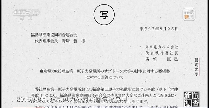 2015年8月,東京電力公司在回復福島縣漁業(yè)協(xié)作組合聯(lián)合會的請愿書時做出書面承諾,在得到包括漁業(yè)從業(yè)者在內的相關人員理解之前,不會對核污染水進行任何處理。