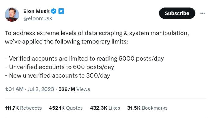收購近一年,馬斯克對于推特的改革仍在進(jìn)行中。他最新宣布要限制用戶每日的推文瀏覽量,以避免使用人工智能模型的公司對推特進(jìn)行“數(shù)據(jù)抓取和系統(tǒng)操縱”。
