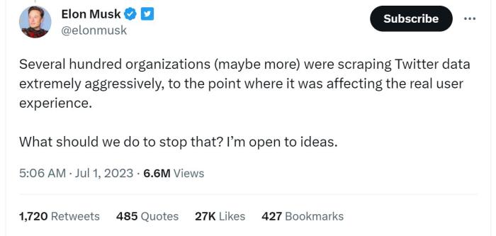 他還發(fā)布推文稱,數(shù)百個(gè)甚至更多的組織正在“極其積極地”抓取推特?cái)?shù)據(jù),“這影響了真正的用戶體驗(yàn)”,但馬斯克尚未說明限制會持續(xù)多久,也并未表示在什么條件下將取消限制。