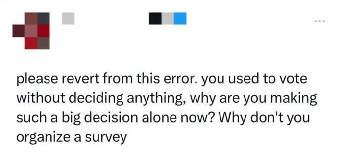 有網(wǎng)友呼吁,“請改正這個(gè)錯(cuò)誤。你以前在投票時(shí)都不做出任何決定,為什么現(xiàn)在要獨(dú)自做出這么大的決定?你為什么不組織一次調(diào)查?!?/p>