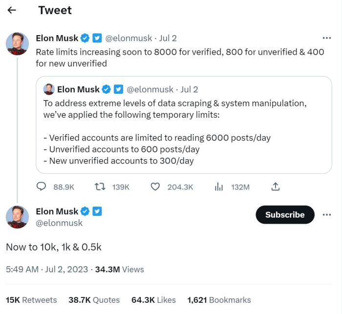 對此,馬斯克很快做出了反應(yīng)。在宣布最初限制后僅幾小時(shí),他又發(fā)文稱,將限制提高到了已驗(yàn)證賬戶8000條、未驗(yàn)證賬戶800條、新的未驗(yàn)證賬戶400條,并在當(dāng)天再次將限制瀏覽量分別提高到了10000條、1000條和500條。