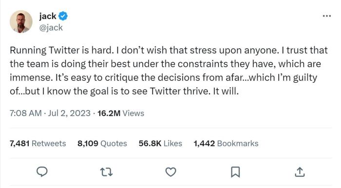 推特聯(lián)合創(chuàng)始人、前首席執(zhí)行官杰克·多爾西隨后發(fā)表了對此事的看法,他表示,“運(yùn)營推特是很困難的。我不希望任何人受到這種壓力。我相信這個(gè)團(tuán)隊(duì)在巨大的限制條件下,正在盡最大努力。從遠(yuǎn)處批評這些決定是很容易的……我也對此感到歉疚……但我知道他們的目標(biāo)是要看到推特的繁榮。它會的?!?/p>
