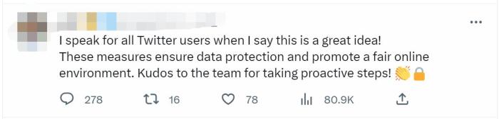 但也有網(wǎng)友對此表示歡迎,表示“我代表所有的推特用戶聲明,這是一個(gè)好主意!這些措施能確保數(shù)據(jù)得到保護(hù),同時(shí)促進(jìn)公平的網(wǎng)絡(luò)環(huán)境。感謝團(tuán)隊(duì)采取積極措施。”