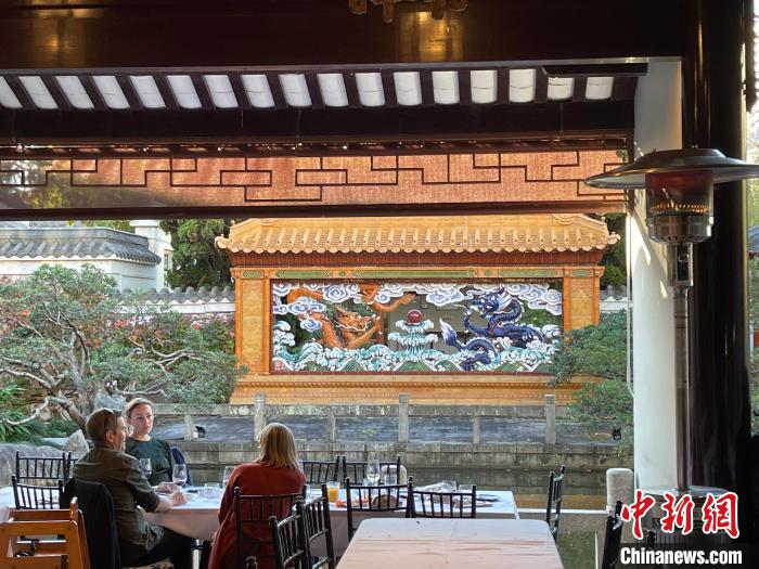 7月1日,游客在誼園“騰龍戲珠”琉璃壁前中餐廳休憩?!×_文俊 攝