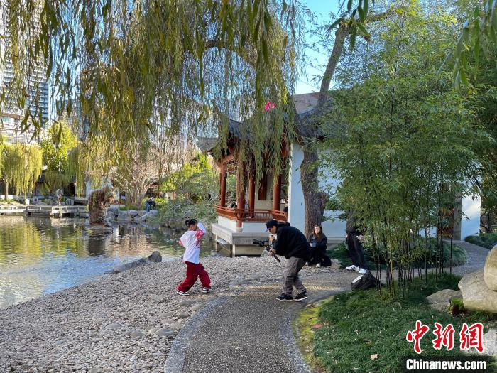 在湖邊,中國(guó)戲曲元素結(jié)合英文說(shuō)唱的音樂(lè)吸引了游客們駐足。在悉尼從事汽修工作十余年的華人楊女士帶著兒子艾迪在湖邊拍攝音樂(lè)短視頻。穿著印有紅色京劇臉譜衛(wèi)衣的艾迪伴著動(dòng)感音樂(lè)起舞?!拔曳浅O矚g這里中西結(jié)合的感覺(jué)。希望在公共場(chǎng)合拍攝能培養(yǎng)孩子的自信心?!睏钆空f(shuō)。