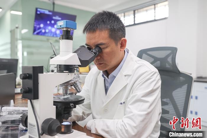 圖為2023年6月19日,景德鎮(zhèn)古陶瓷基因庫實(shí)驗(yàn)室內(nèi),景德鎮(zhèn)御窯博物院院長翁彥俊使用電子顯微鏡在觀察古陶瓷標(biāo)本。 中新社記者 劉力鑫 攝