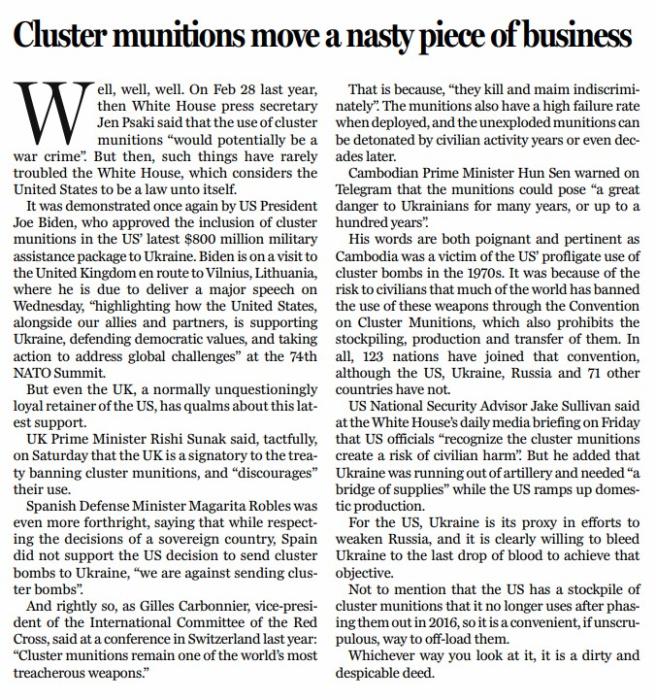 對美國來說,烏克蘭是削弱俄羅斯的代理人,為了這一目的,美國顯然愿意讓烏克蘭流盡最后一滴血。其次,美國擁有大量集束彈藥, 2016年起逐步淘汰一批,現(xiàn)在打著援助烏克蘭的旗號也是一種處理方式。因此,無論怎么看,這都是一種骯臟下流、卑鄙無恥的行徑。