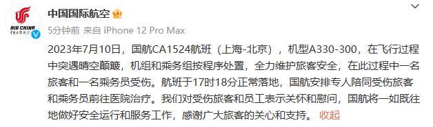 事后,據(jù)國(guó)航回應(yīng),在此過程中一名旅客和一名乘務(wù)員受傷。航班于17時(shí)18分正常落地,國(guó)航安排專人陪同受傷旅客和乘務(wù)員前往醫(yī)院治療。