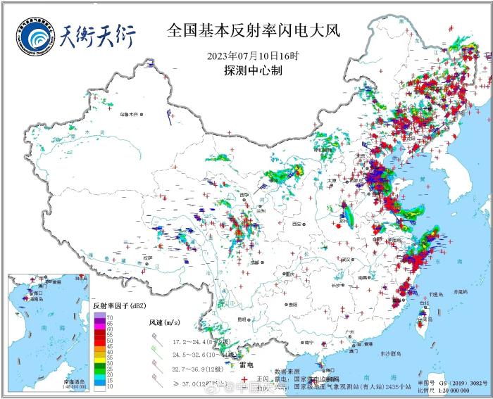 7月10日全國(guó)基本反射率閃電大風(fēng)。圖片來源:@中國(guó)天氣微博