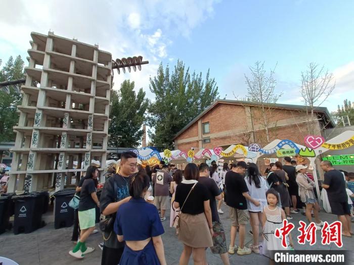 7月8日晚上8點(diǎn),盡管天色已經(jīng)暗下來(lái),但北京的地表溫度仍在30℃以上。在798藝術(shù)區(qū)南門(mén),一處方形場(chǎng)地被分割成幾排街道,200余家商鋪聚集在這里。在臨時(shí)搭建的白色攤位前,擠滿(mǎn)了游客。