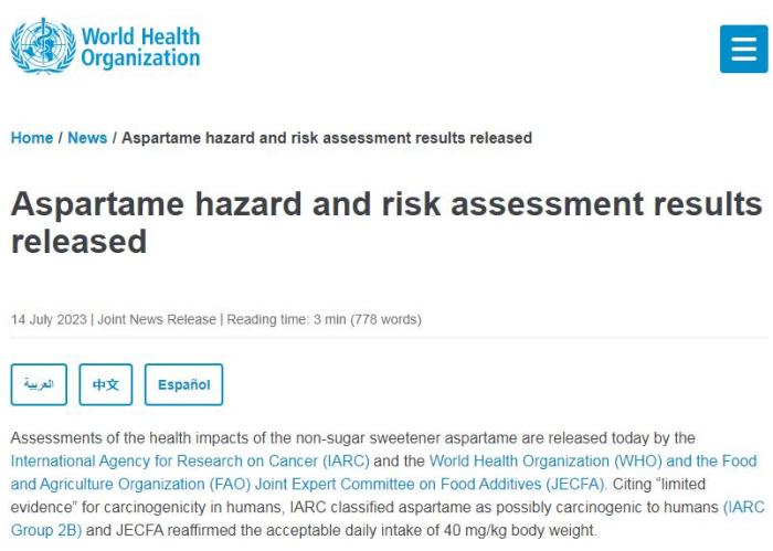 中新網(wǎng)7月14日電 綜合報(bào)道,世界衛(wèi)生組織官網(wǎng)當(dāng)?shù)貢r(shí)間14日發(fā)布相關(guān)評(píng)估結(jié)果,將阿斯巴甜(一種人造甜味劑)列為可能致癌物,但補(bǔ)充說,如果每天攝入量不超過每公斤體重40毫克,攝入阿斯巴甜是安全的。