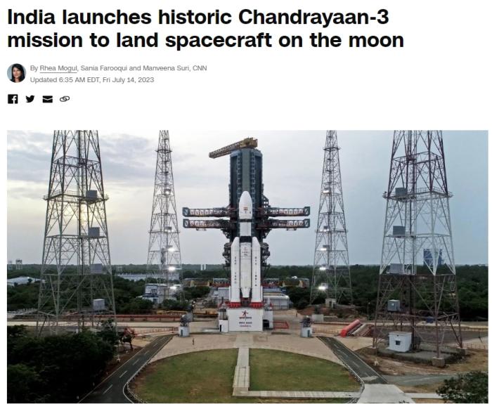 中新網(wǎng)7月14日電 據(jù)美國有線電視新聞網(wǎng)(CNN)報道,當(dāng)?shù)貢r間14日下午,印度“月船3號”月球探測器發(fā)射升空。報道稱,如果該月球探測器8月著陸成功,印度將成為第4個在月球表面軟著陸的國家。