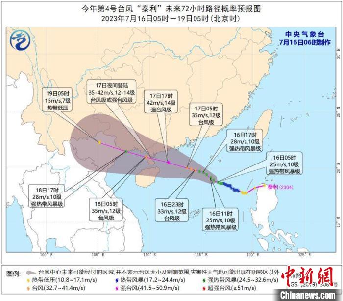 海南省氣象臺預(yù)計,“泰利”中心將以每小時15公里左右的速度向西北方向移動,強度繼續(xù)增強,并于17日夜間在海南文昌到廣東臺山一帶沿海登陸(臺風(fēng)級或強臺風(fēng)級,35~42米/秒,12~14級),之后于18日進入北部灣,以后趨向越南北部沿海和廣西沿海。