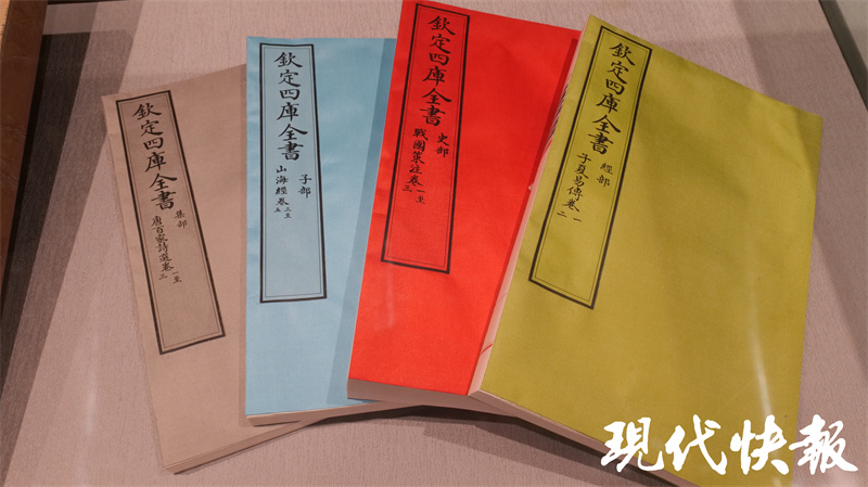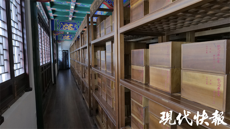 文匯閣二樓、三樓收藏了一部《四庫全書》,據(jù)了解,這部《四庫全書》是2013年由商務印書館榮譽出版、揚州國書文化公司策劃制作的原樣、原大、原色《四庫全書》復制本。它與原書大小、顏色、紙質(zhì)、裝幀相同,封面仍是絹帛五色:經(jīng)部綠色、史部紅色、子部月白色、集部灰黑色、總目黃色。書籍與書函、書架配套,共計木函6144個、書架128個?!端膸烊珪返难b潢非??季?,每部書籍都用兩片楠木片夾住,束以綢帶,再放入楠木盒中。盒蓋上刻有書籍的書名和所屬部類順序等信息,以便查閱?,F(xiàn)在,游客經(jīng)過預約就可以可到二樓參觀《四庫全書》部分藏書,親身感受這套浩瀚巨制。