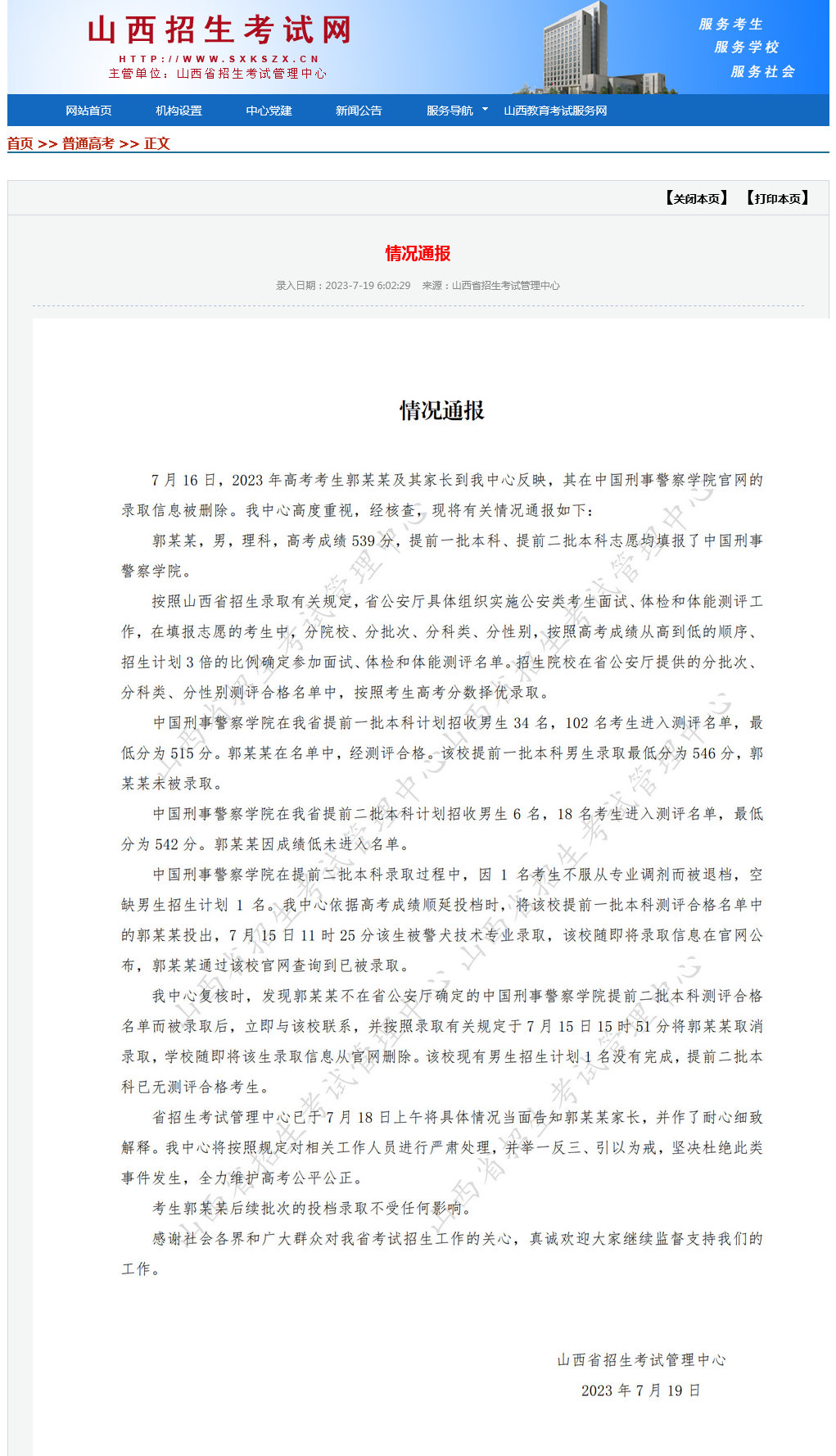 中新網(wǎng)7月19日電 據(jù)山西招生考試網(wǎng)消息,山西省招生考試管理中心19日發(fā)布情況通報稱,7月16日,2023年高考考生郭某某及其家長到該中心反映,其在中國刑事警察學(xué)院官網(wǎng)的錄取信息被刪除。該中心高度重視,經(jīng)核查,有關(guān)情況如下: