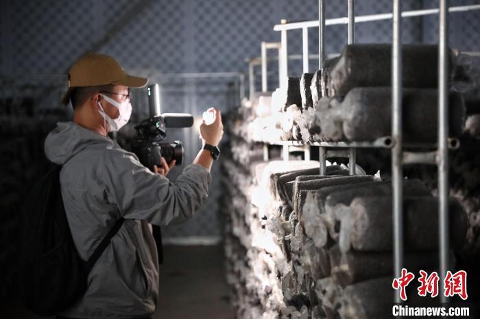 7月17日,甘肅省古浪縣,參加“絲路風(fēng)采 如意甘肅”聯(lián)合采訪活動(dòng)的兩岸及香港記者在當(dāng)?shù)仞B(yǎng)菌出菇的冷庫(kù)內(nèi)采訪拍攝?!≈行律缬浾?李雪峰 攝