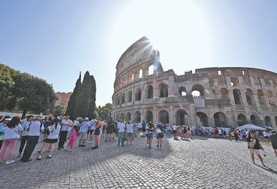 意大利首都羅馬7月18日最高氣溫超過41攝氏度,是今年以來當(dāng)?shù)刈罡邭鉁?。圖為當(dāng)天,游客聚集在羅馬斗獸場附近。