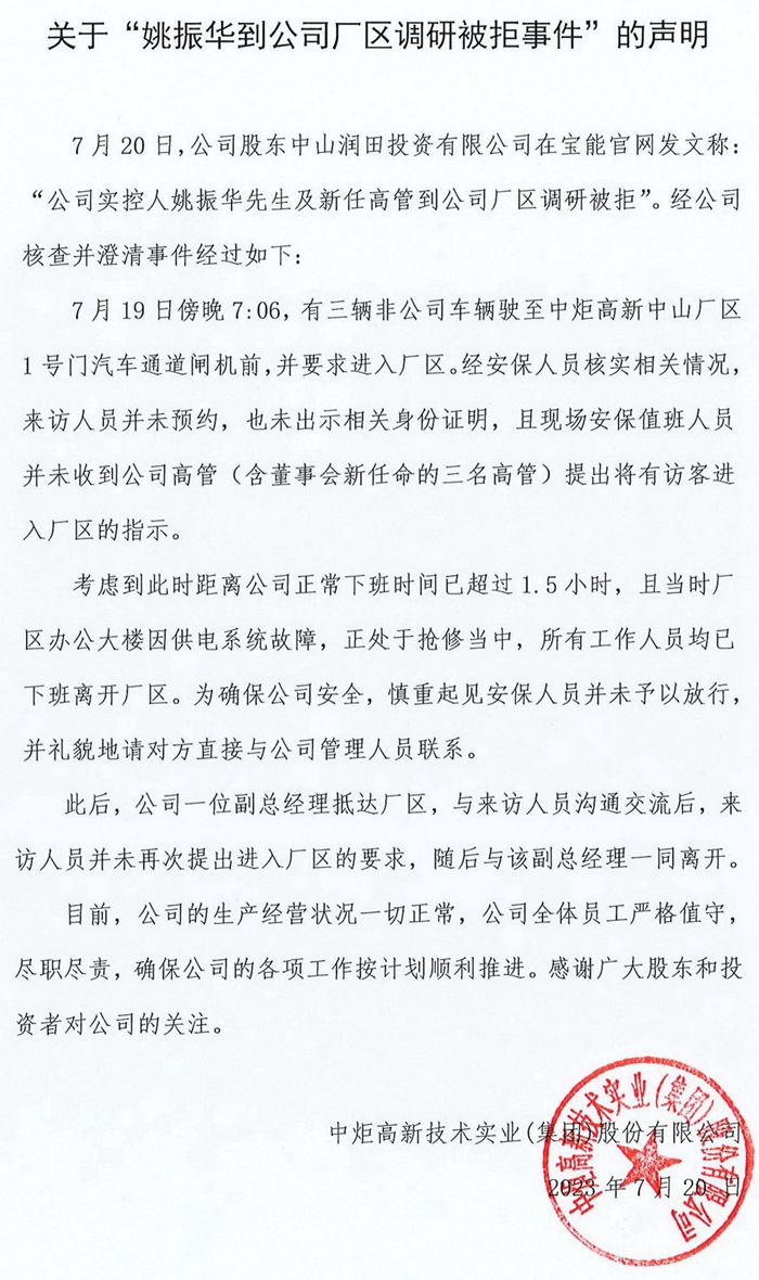 近日,“寶能系”股東中山潤田在寶能集團官網發(fā)布聲明稱,寶能集團董事長姚振華得知中炬高新日常管理工作出現重大紕漏的相關情況后,非常擔憂上市公司的生產安全及食品安全問題,趕往中山中炬高新總部,調研生產經營情況。未曾想,竟被保安拒絕進入。