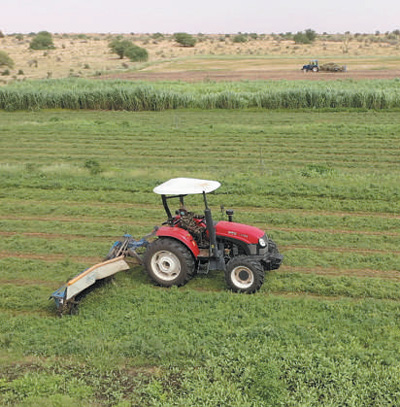 在中國援毛里塔尼亞畜牧業(yè)技術示范中心,工作人員操作機械收割紫花苜蓿。