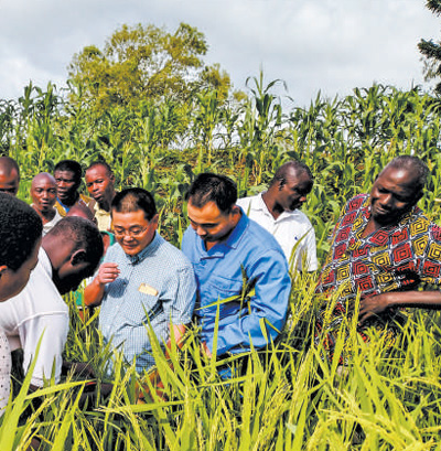 中國中化控股有限責任公司旗下荃銀高科的水稻專家在多哥示范田現場,為當地農民講解水稻抽穗揚花期的關鍵技術和田間管理要點。