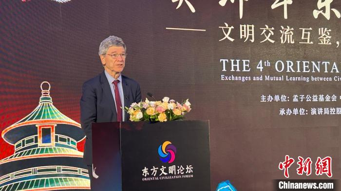 2023年7月23日,哈佛大學(xué)國(guó)際研究中心主任、哥倫比亞大學(xué)經(jīng)濟(jì)學(xué)教授杰弗里·薩克斯在第四屆東方文明論壇上作主題演講。 中新社記者 鄧力垚 攝