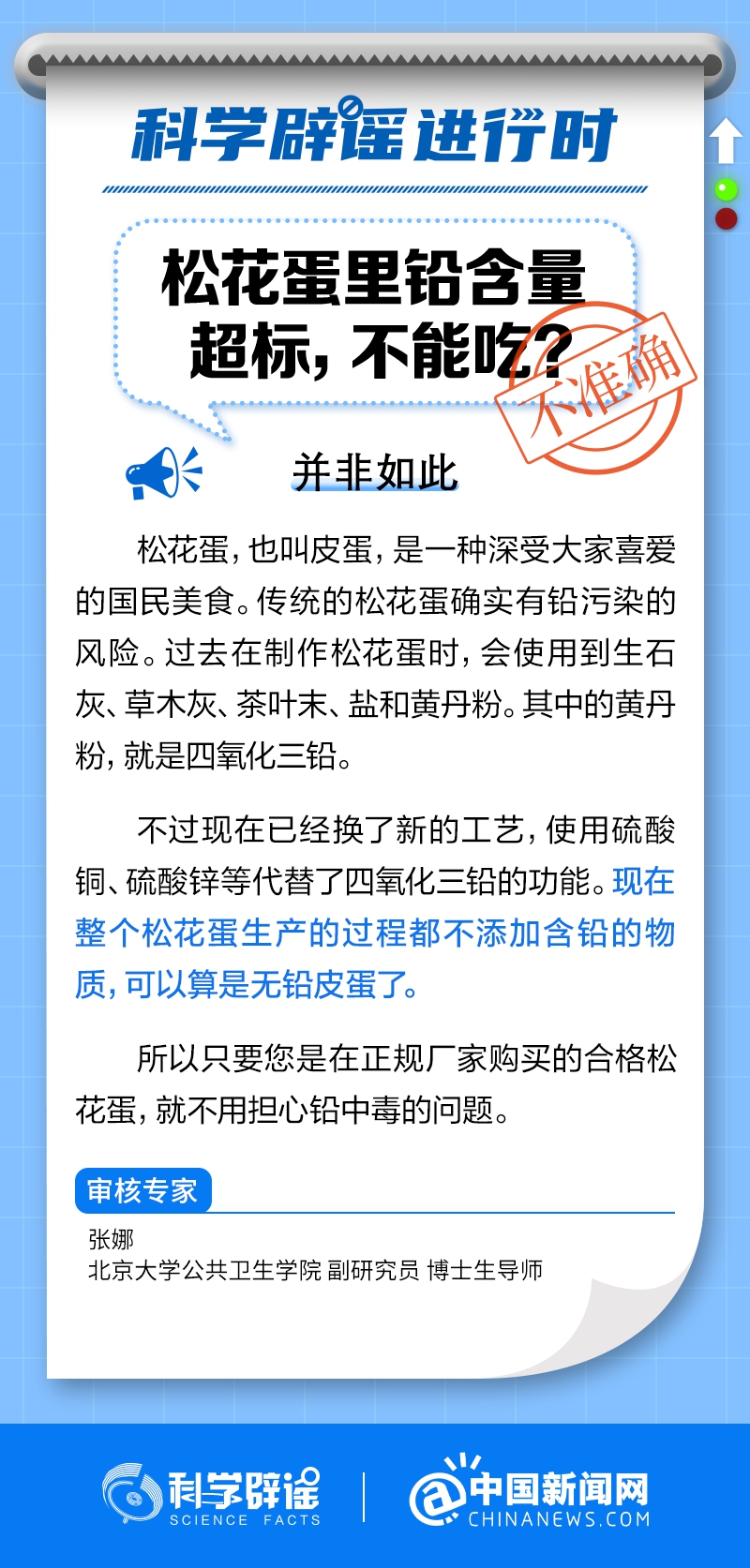 過(guò)去在制作松花蛋時(shí),會(huì)使用到生石灰、草木灰、茶葉末、鹽和黃丹粉。其中的黃丹粉,就是四氧化三鉛。不過(guò)現(xiàn)在已經(jīng)換了新的工藝,使用硫酸銅、硫酸鋅等代替了四氧化三鉛的功能?,F(xiàn)在整個(gè)松花蛋生產(chǎn)的過(guò)程都不添加含鉛的物質(zhì),可以算是無(wú)鉛皮蛋了。(來(lái)源:科學(xué)辟謠、中國(guó)新聞網(wǎng)微博)