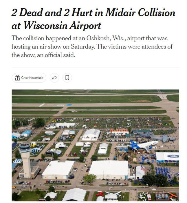 據(jù)《紐約時(shí)報(bào)》報(bào)道,美國(guó)聯(lián)邦航空管理局(FAA)稱,事故發(fā)生在威斯康星州奧什科什的惠特曼地區(qū)機(jī)場(chǎng)。在為期一周的活動(dòng)中,“實(shí)驗(yàn)飛機(jī)協(xié)會(huì)”在此舉辦飛行表演和航展。