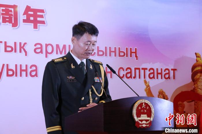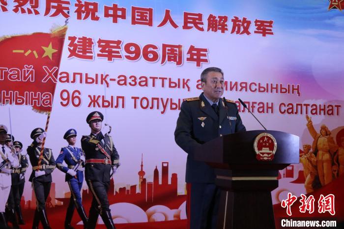 當(dāng)?shù)貢r(shí)間7月28日晚,哈薩克斯坦阿斯塔納,中國駐哈薩克斯坦大使館舉行慶祝中國人民解放軍建軍96周年招待會(huì)。圖為國防武官胡德君大校在致辭中?! ≈行戮W(wǎng)記者 張碩 攝