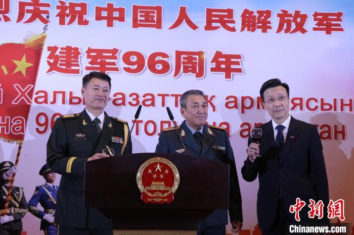 當(dāng)?shù)貢r(shí)間7月28日晚,哈薩克斯坦阿斯塔納,中國駐哈薩克斯坦大使館隆重舉行慶祝中國人民解放軍建軍96周年招待會(huì)。圖中從左至右依次為:國防武官胡德君大校、哈國防部副部長卡馬列特季諾夫中將、駐哈大使張霄。 中新網(wǎng)記者 張碩 攝