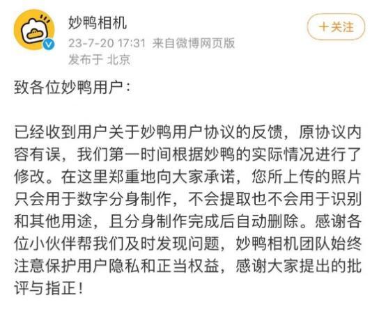 對此,妙鴨相機在7月20日回應稱,原協(xié)議內(nèi)容有誤,并第一時間刪除了相關條款。