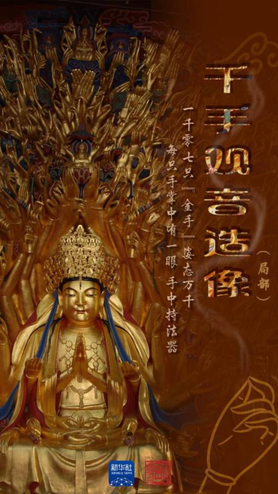 走近看,這座造像頭頂和兩側(cè),孔雀開屏般放射狀地浮雕著1007只“金手”。造像手中的法器展現(xiàn)了古代人民的生活用具、勞動工具以及戰(zhàn)爭武器,有著重要的歷史價值。
