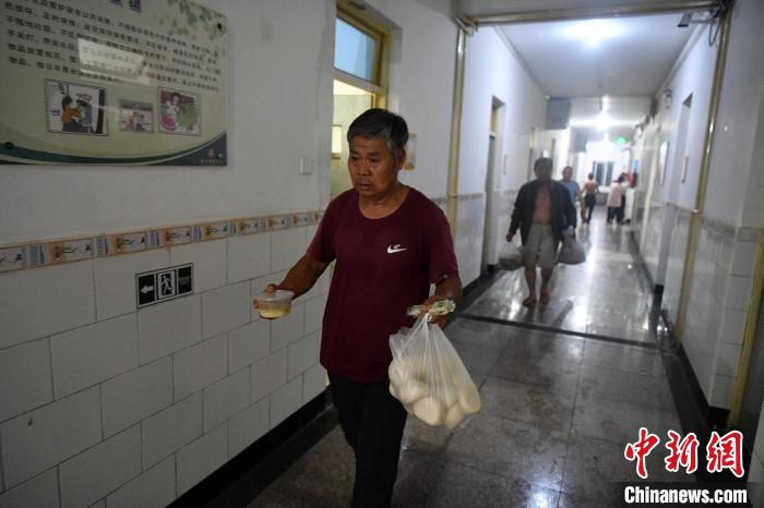 這是一間有八張床位的學(xué)生宿舍,屋頂?shù)碾娚纫恢贝抵?。?dāng)記者走進(jìn)房間時(shí),劉玉霞正吃著丈夫剛領(lǐng)回的盒飯?!耙粋€(gè)是白菜粉條,一個(gè)是木須肉,還有湯,挺好?!痹诶先丝磥恚晏炖锍钥跓犸?,“家人平安已知足”。