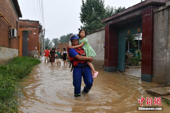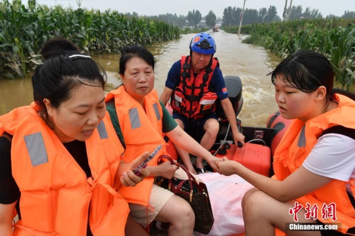 8月3日,藍(lán)天救援隊(duì)隊(duì)員在河北省涿州市刁窩鎮(zhèn)東馮村轉(zhuǎn)移村民。據(jù)該村村民介紹,當(dāng)日村里水位相比昨日有所下降,村中還有部分老人和孩子。經(jīng)過一上午救援,十余名村民被轉(zhuǎn)移到安全地帶。中新社記者 翟羽佳 攝