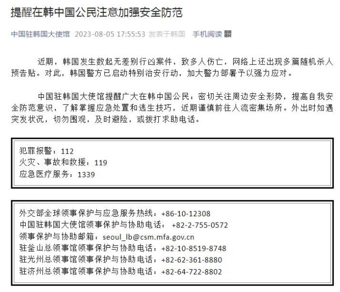 中新網(wǎng)8月5日電 據(jù)中國駐韓國大使館微信公眾號5日消息,近期,韓國發(fā)生數(shù)起無差別行兇案件,致多人傷亡,網(wǎng)絡(luò)上還出現(xiàn)多篇隨機(jī)殺人預(yù)告貼。對此,韓國警方已啟動(dòng)特別治安行動(dòng),加大警力部署予以強(qiáng)力應(yīng)對。