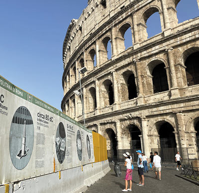在意大利羅馬熱門景點斗獸場,游客正在閱讀帶有中文解說的標(biāo)識牌。