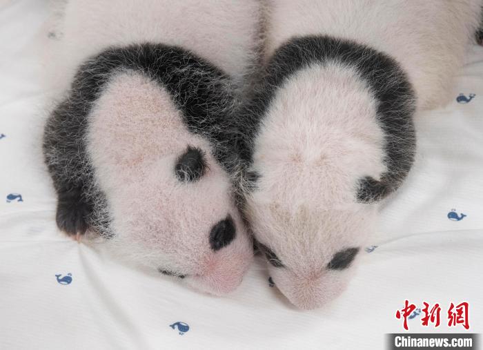 當(dāng)?shù)貢r間8月7日,韓國三星愛寶樂園公布雌性雙胞胎大熊貓幼崽(左為姐姐)于前一天拍攝的滿月照。 (愛寶樂園供圖)
