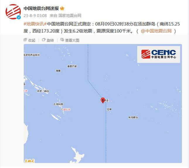 中國地震臺(tái)網(wǎng)正式測定:08月09日02時(shí)38分在湯加群島(南緯15.25度,西經(jīng)173.20度)發(fā)生6.2級(jí)地震,震源深度100千米。(國家地震臺(tái)網(wǎng)官方微博)