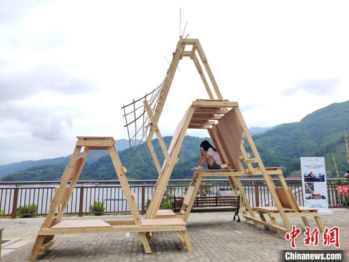 “高低起伏的木板,代表了環(huán)繞在雄江鎮(zhèn)旁的群山,座椅蜿蜒的形狀則是波浪滔滔的閩江。”來自臺(tái)灣華夏科技大學(xué)的學(xué)生陳廷宇如是介紹作品《禹岳》。