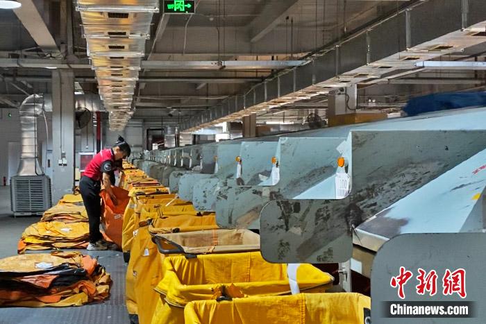 員工在圓通速遞分揀中心辛勤工作。中新財經(jīng) 葛成 攝