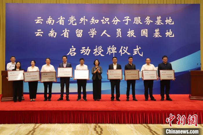 圖為云南省委常委、省委統(tǒng)戰(zhàn)部部長、省委教育工委書記楊寧(右五)為黨外知識分子服務(wù)基地和留學(xué)人員報國基地授牌。崔永江 攝
