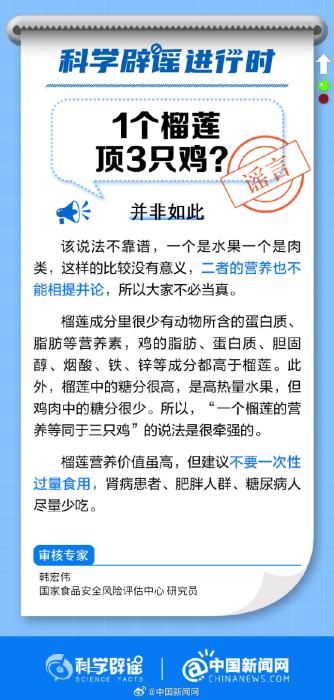 中新網(wǎng)8月15日電 1個榴蓮頂3只雞?該說法不靠譜,一個是水果一個是肉類,這樣的比較沒有意義,二者的營養(yǎng)也不能相提并論。雖然榴蓮營養(yǎng)價值高,但還是建議不要一次性過量食用,腎病患者、肥胖人群、糖尿病人盡量少吃。(來源:@科學(xué)辟謠 @中國新聞網(wǎng) )
