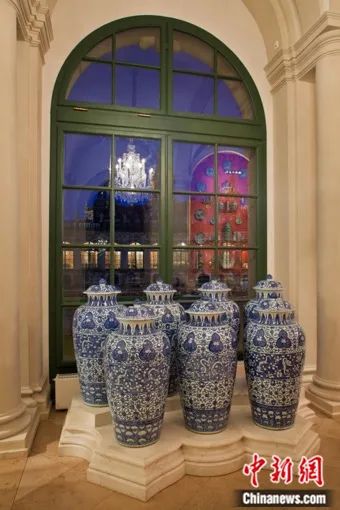 中國清朝時期的釉下藍色紀(jì)念性花瓶,即南部拱形長廊中的所謂龍騎兵花瓶。版權(quán)所有:德累斯頓國家藝術(shù)收藏館瓷器館藏。照片:Jürgen Lsel
