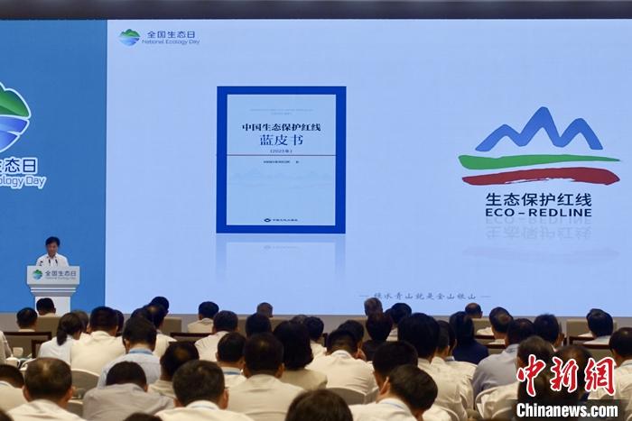 8月15日,首個(gè)全國生態(tài)日主場活動(dòng)在浙江湖州舉行,中國國家發(fā)改委、中國自然資源部等部門發(fā)布碳達(dá)峰碳中和重大宣示三周年重要成果、《中國生態(tài)保護(hù)紅線藍(lán)皮書(2023年)》等多方面的成果成效。圖為《中國生態(tài)保護(hù)紅線藍(lán)皮書(2023年)》發(fā)布。 中新社記者 錢晨菲 攝