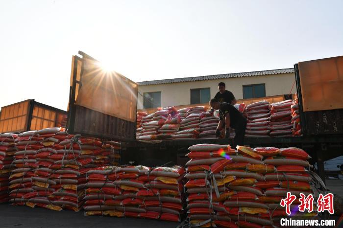 8月15日,河北省涿州市供銷社農(nóng)資集采集配中心,一輛滿載34噸冬小麥種子的農(nóng)資配送車輛抵達(dá)這里,工人們正在卸車。中新社記者 翟羽佳 攝